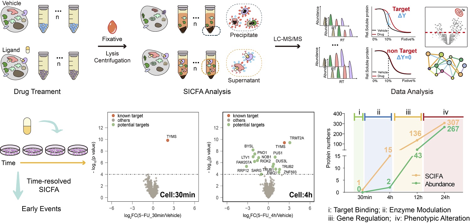 近日,我所生物技术研究部生物分离分析新材料与新技术研究组(1809组)叶明亮研究员团队开发了一种名为“溶剂诱导细胞部分固定法”(Solvent-Induced partial Cellular Fixation Approach,SICFA)的蛋白质组学新方法。该方法可在活细胞中原位、高通量地识别药物结合靶点及其下游早期效应蛋白,并揭示药物作用在细胞内的动态调节顺序。其核心优势在于无需裂解细胞,在保持细胞结构完整性的条件下实现对药物早期分子事件的系统解析,为药物机制研究和临床前药效评估提供了有力的技术工具。